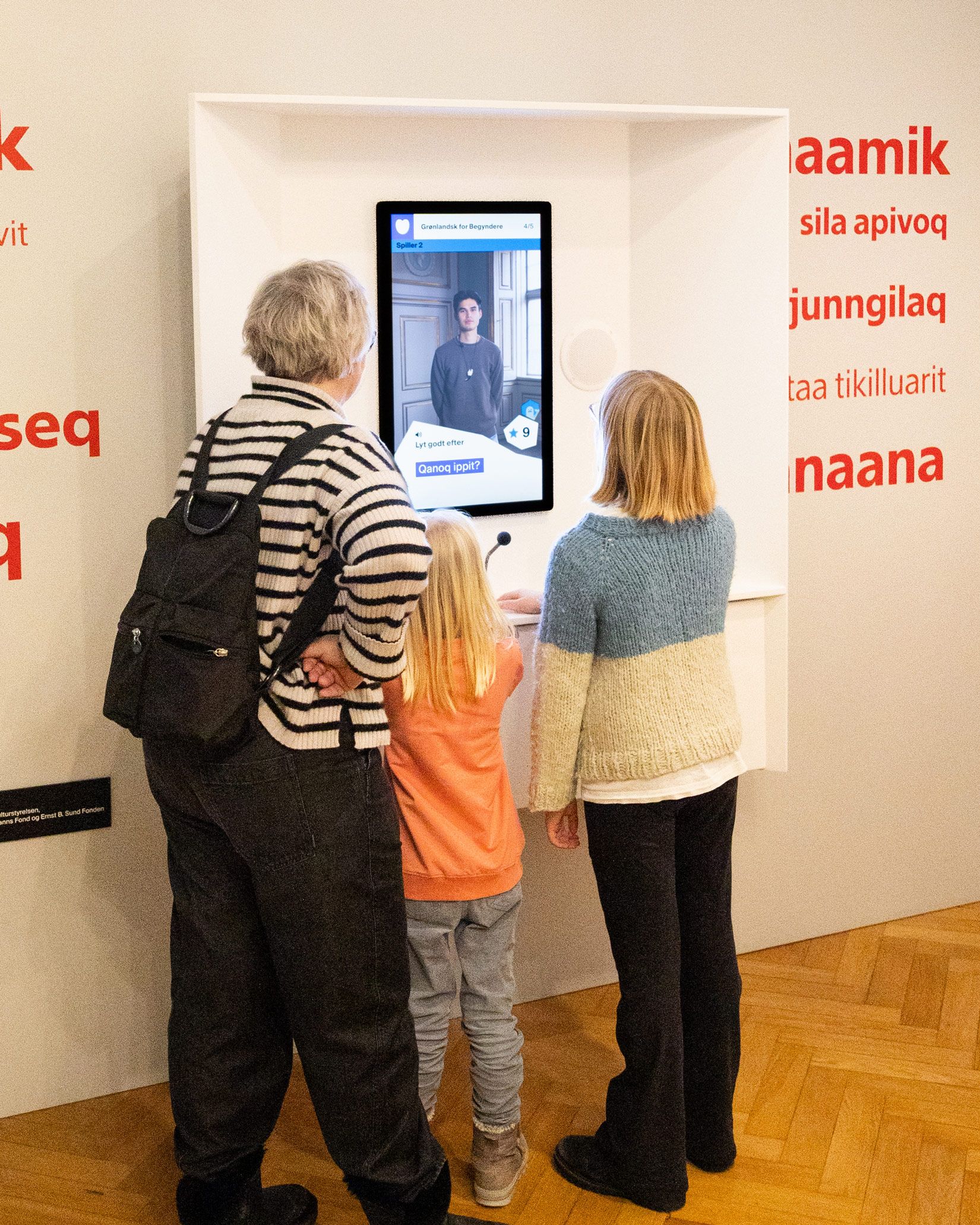 Try your hand at Greenlandic in our language installation Greenlandic for Beginners. Here, language becomes a sensory experience as you listen, repeat, and test your pronunciation of Greenlandic words – and discover how the machine responds to how they are actually spoken. Greenlandic is known for its long, compound words and precise sounds that reflect life and nature in the Arctic. Developed in collaboration with language researchers, the installation offers an introduction to the sound, rhythm, and structure of the language. The aim is not to make you fluent, but to give you a sense of a language that is a central part of Inuit cultures, past and present. The language installation is a permanent feature of the exhibition and can be explored by both children and adults.
